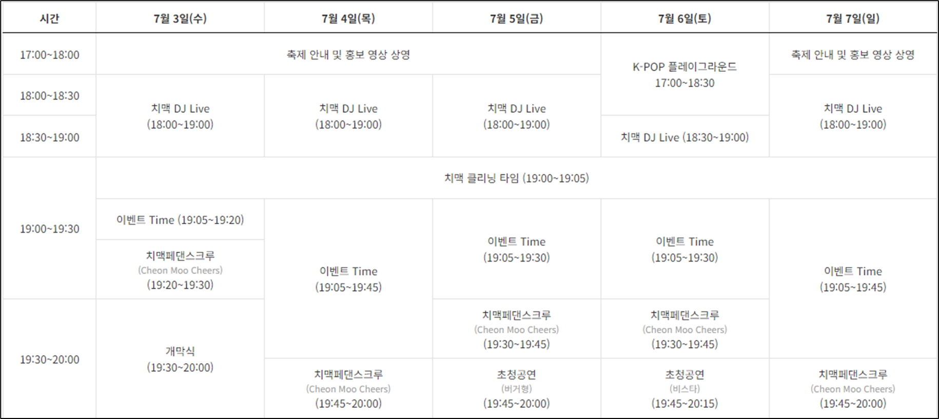 - 주요 프로그램 : 치킨 및 맥주 부스, 라이브 공연, 체험 이벤트 등