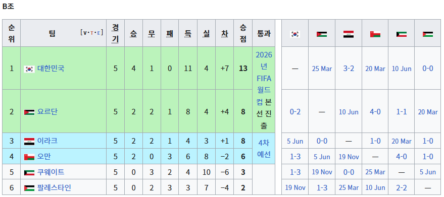 11월 15일 현재 B조는 대한민국, A조는 일본이 1위를 기록하며 월드컵 본선 진출 가능성이 상당히 높아져 있습니다. 거의 확정적이라고 보아도 좋을 상황인데요. C조의 중국이 2승이나 기록했다는 점이 조금 놀랍네요 🙄